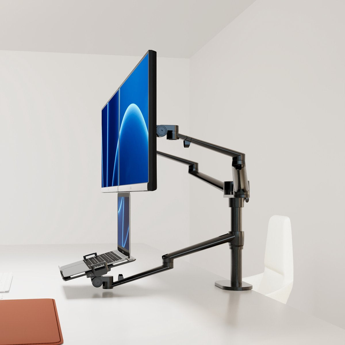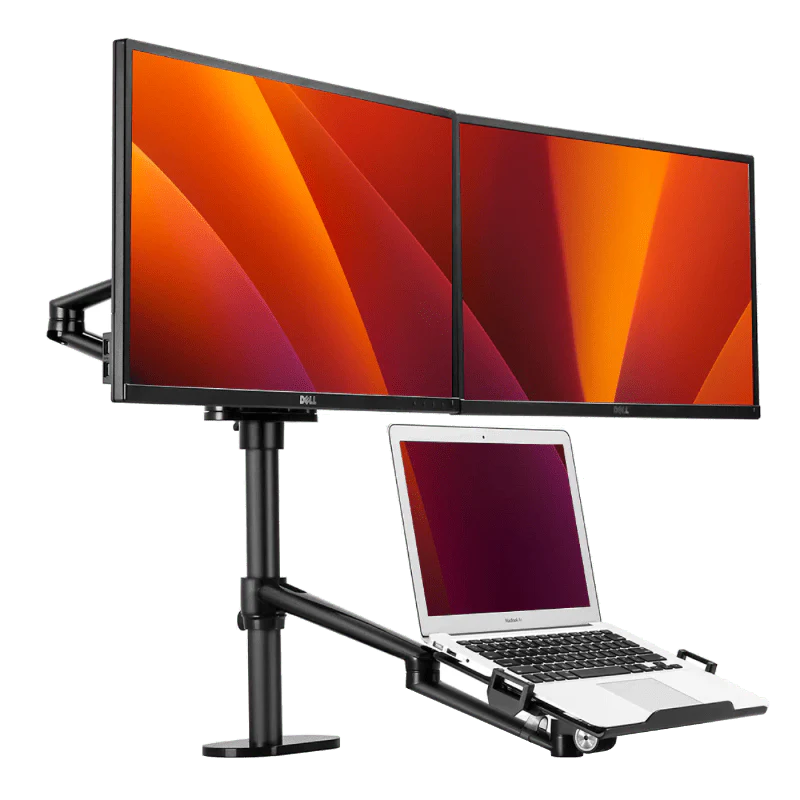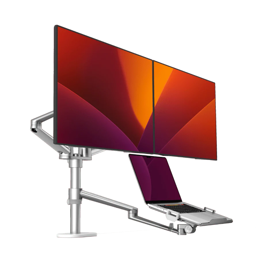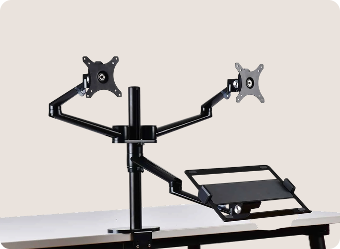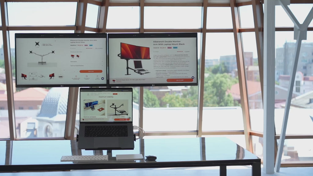 Upgrade your workspace with the Alberenz® Dual Monitor Arm with Laptop Stand and experience the ultimate combination of functionality and design for more productivity and comfort.